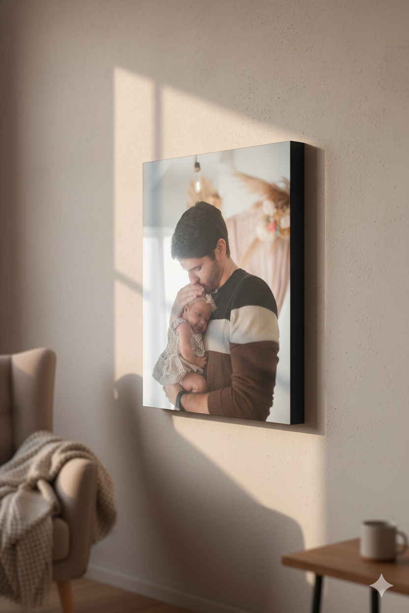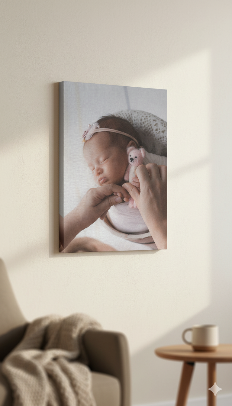 Imagine as fotos mais preciosas do seu bebê ou da sua família com a textura linda de uma tela de pintura! Nossa Tela Canvas imprime suas memórias em um tecido especial, montado em um chassi de madeira que dá um visual elegante e artístico. É como ter uma obra de arte exclusiva em casa, contando sua história.
