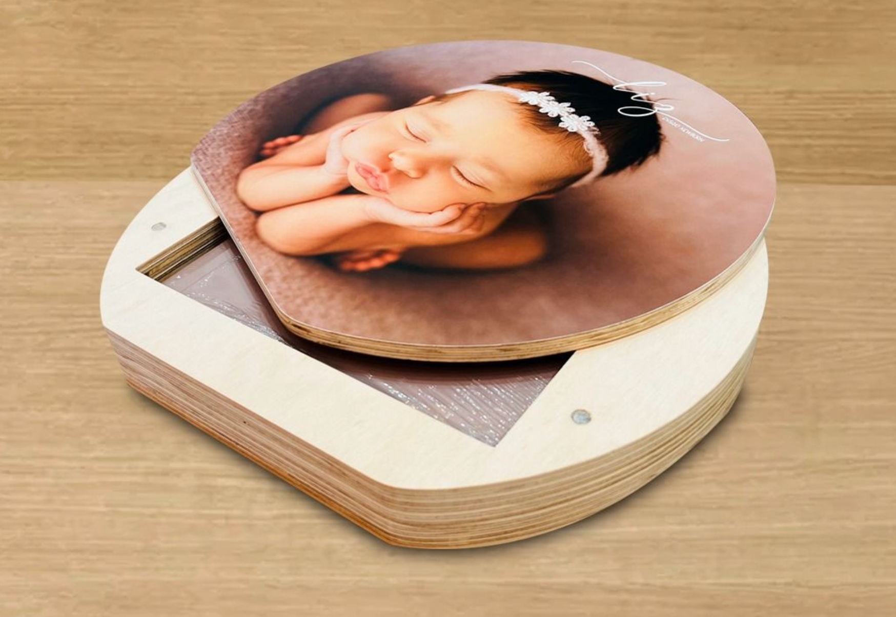 Opções com e sem acrílico. Moderna e inovadora, a Caixa dos Sonhos Decorativa une armazenamento e decoração em um único design. Feita em MDF com fechamento magnético, possui impressão personalizada tipografada e um design pensado para ser exposto em pé, como um quadro, trazendo um toque especial para sue ambiente. Uma embalagem diferenciada que valoriza ainda mais o seu álbum!
