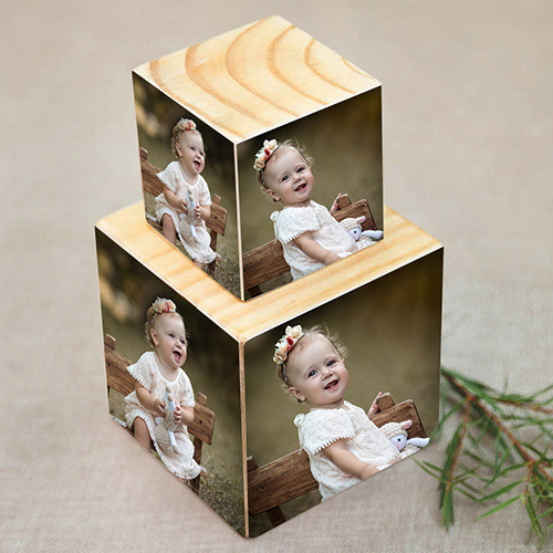 Um jeito especial de eternizar suas memórias! Esse kit conta com dois cubos de madeira nos tamanhos 9x9x9cm e 6x6x6cm, cada um com 5 fotos impressas em papel fotográfico, totalizando