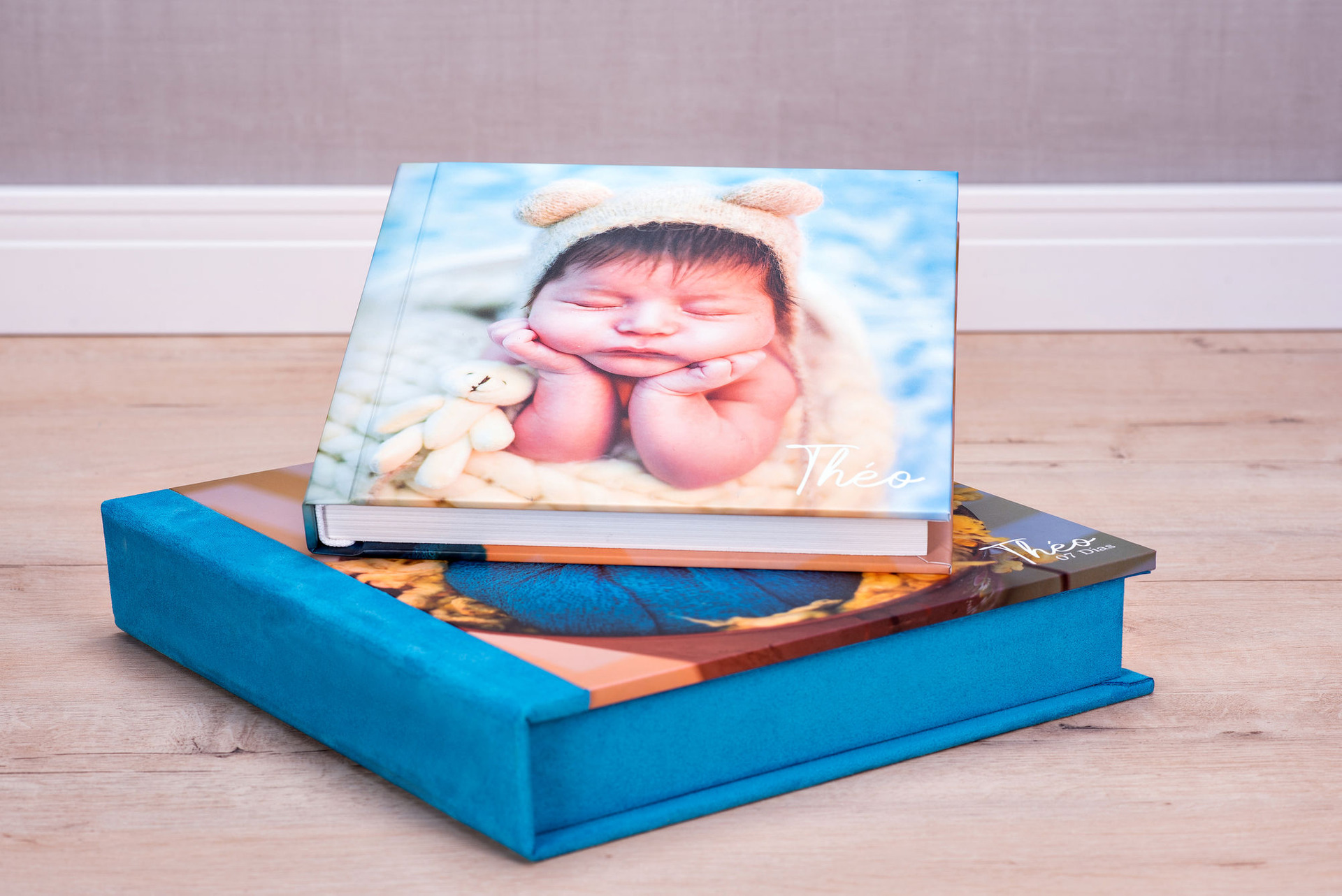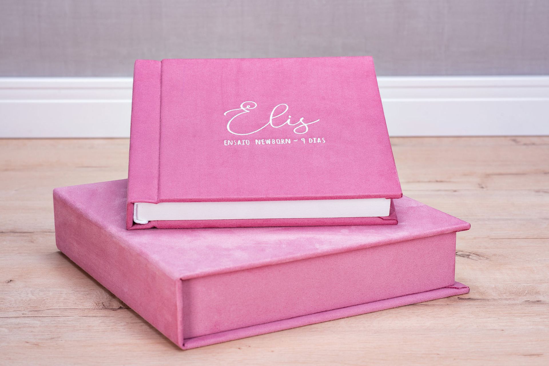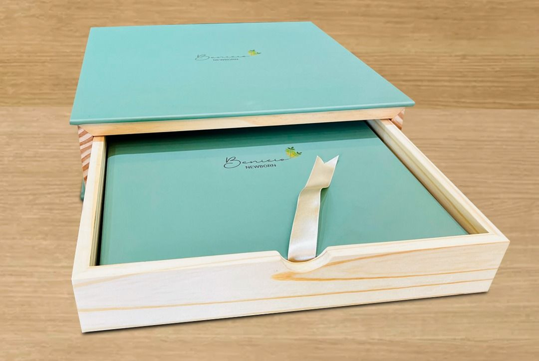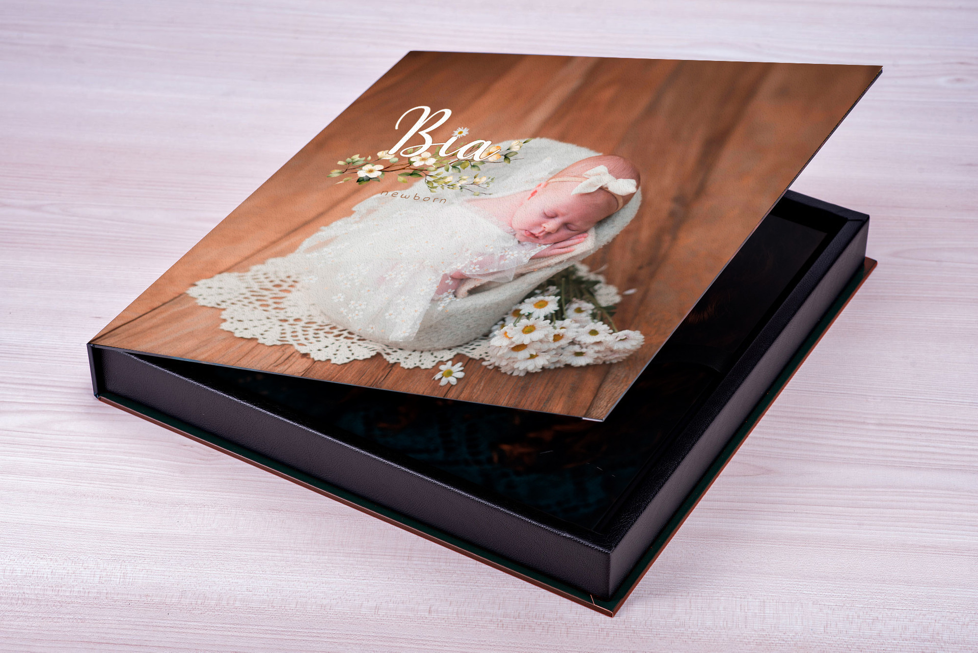 Proteção e elegância para armazenar seu álbum com segurança. Disponível na versão fotográfica, com capa em papel fotográfico laminado, ou na versão sintética, revestida em tecido ou courino, que permite personalização com impressão UV, tipografia bordada ou placa decorativa. Ambas oferecem proteção contra poeira e sujeira, além da opção adicional de compartimento para pendrive e fita interna personalizada (também adicional).